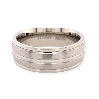 Crafted from durable titanium, this ring features a sophisticated brushed finish on both sides, offering a modern and refined look.