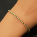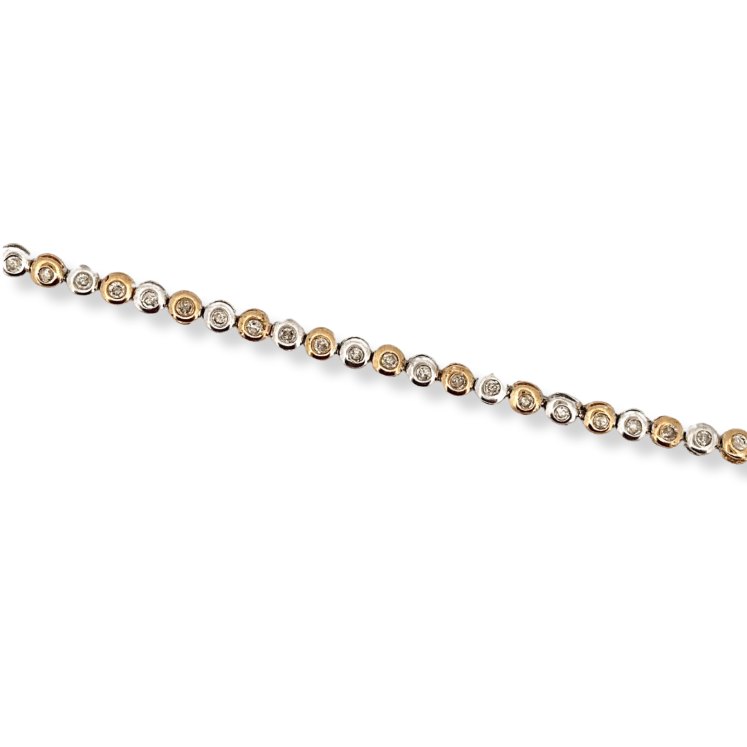 Exquisite yet eye-catching, this 9ct two-tone diamond bracelet will make a statement wherever you go. The 1.01ct diamonds are delicately set around a 9ct white and yellow gold band, creating a subtle contrast that will make your wrist shine.  21cm