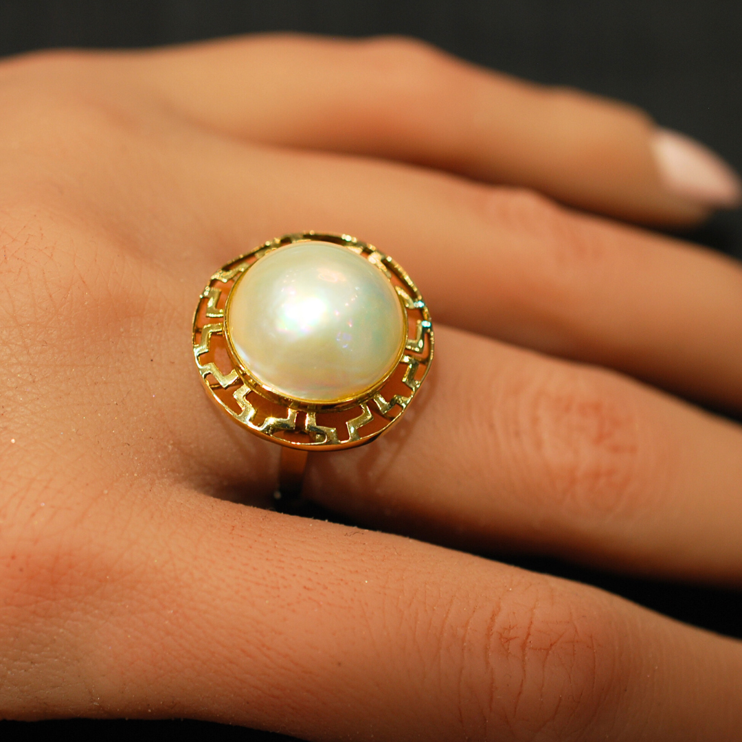 This 9ct yellow gold mabe ring is crafted with superior quality 9ct yellow gold and adorned with a stunning pearl. The combination of these materials not only adds a touch of elegance to any outfit but also ensures durability and lasting beauty.