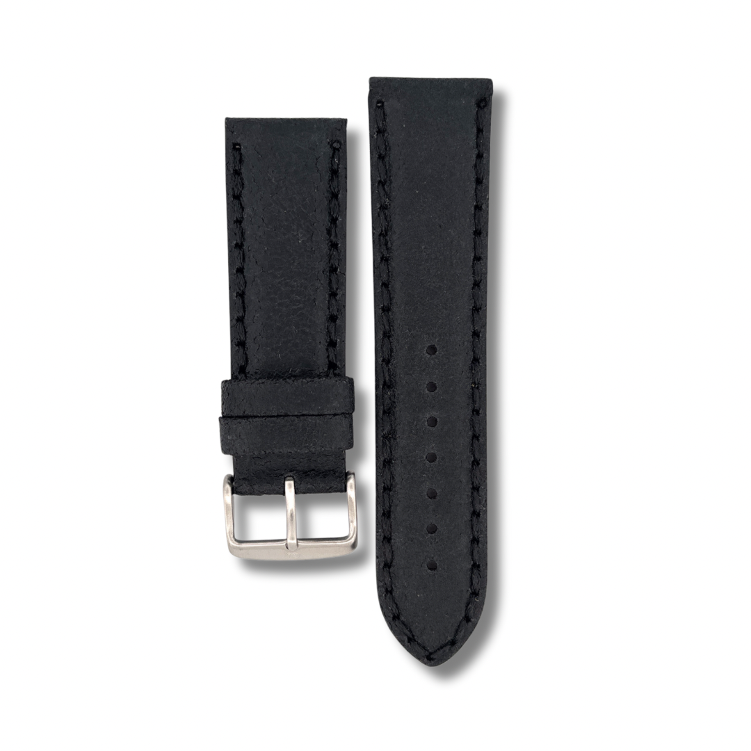 This 24mm black leather band features 3.5mm thickness and rawhide feel. It is further bolstered by thick stitching for durability.
