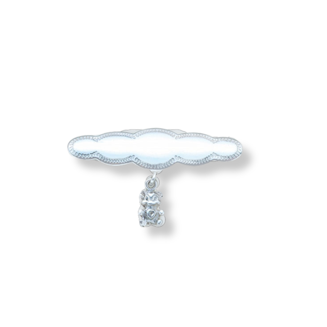 This exquisite Baby Brooch is crafted in Sterling Silver and features a blank surface for personalization through engraving. The delicate design showcases a charming teddy bear hanging from the brooch, making it a perfect gift for any new parent or baby shower. 40mm and 8mm width