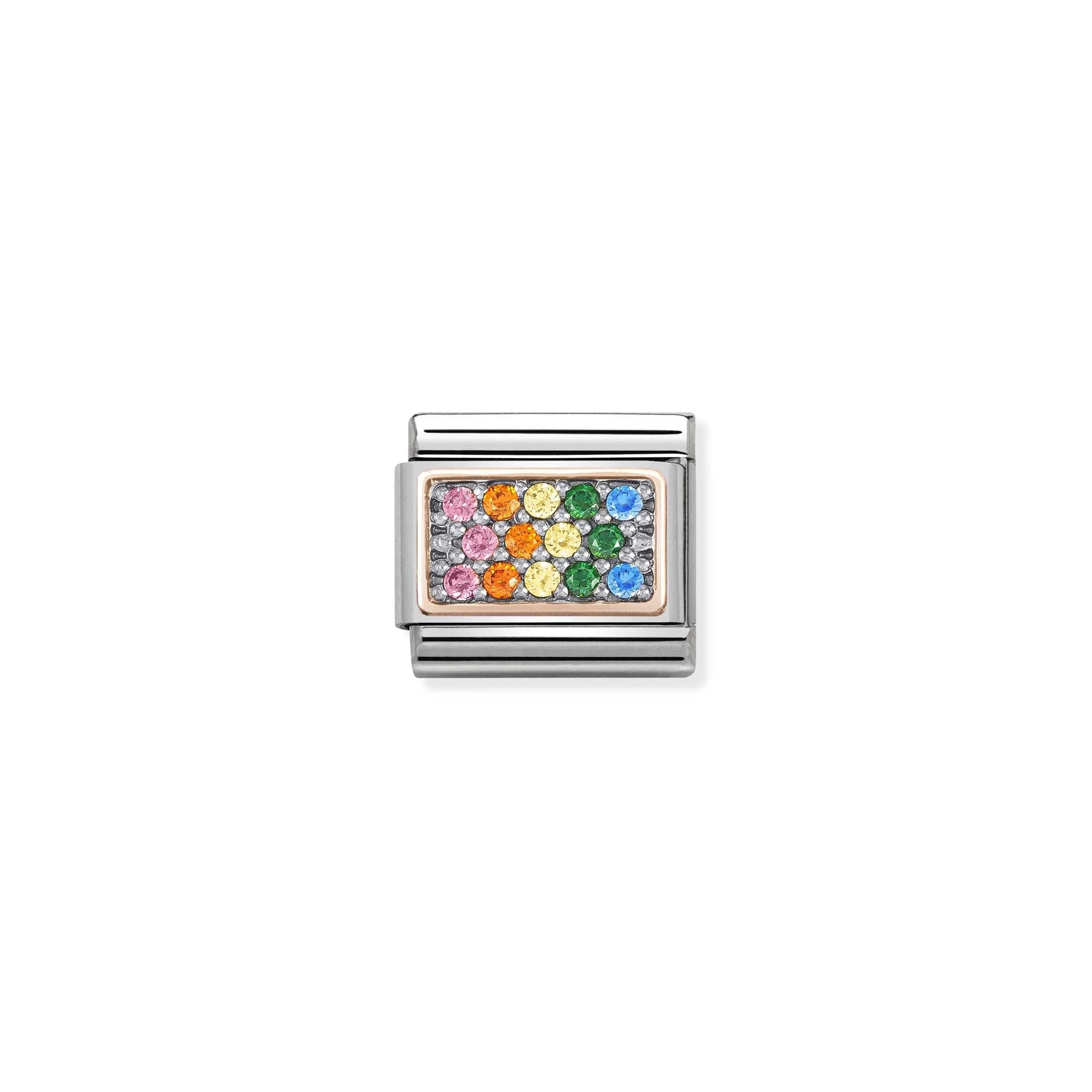 Stainless steel charm for original Nomination Composable Classic bracelet, multicolour Cubic Zirconia and details in 9K rose gold. Made in Italy. Pink, orange, yellow, green and blue: 5 colours in one charm.