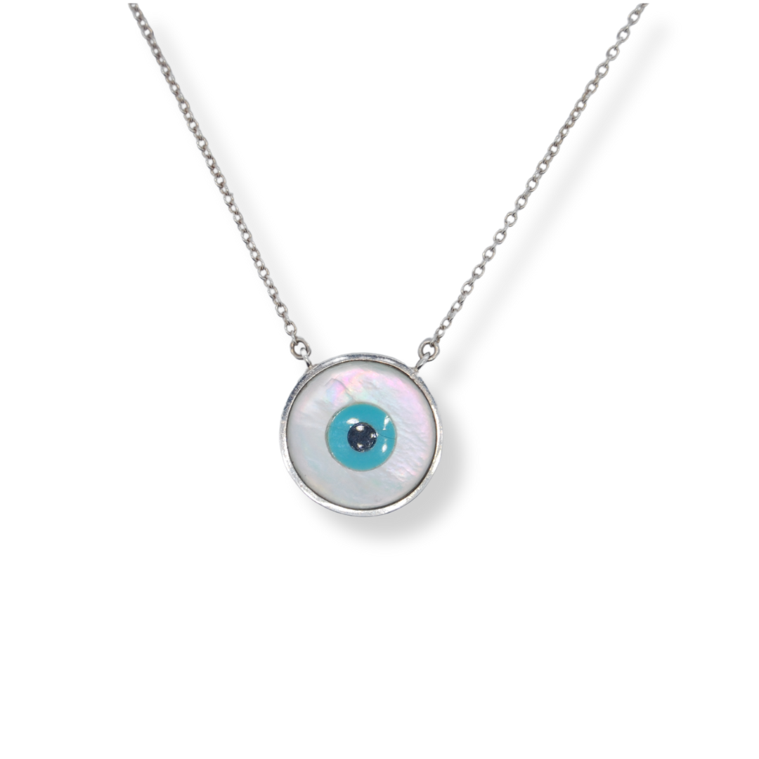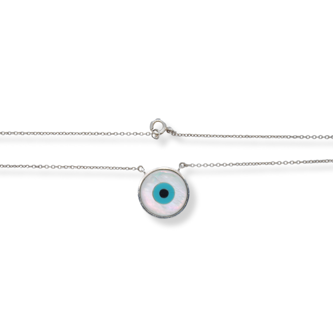 This Greek Evil Eye pendant features a sterling silver chain with a beautiful mother of pearl & evil eye. The perfect accessory to protect against negative energy and bring positivity to your life. Expertly crafted and scientifically proven, with 100% sterling silver and natural materials.
