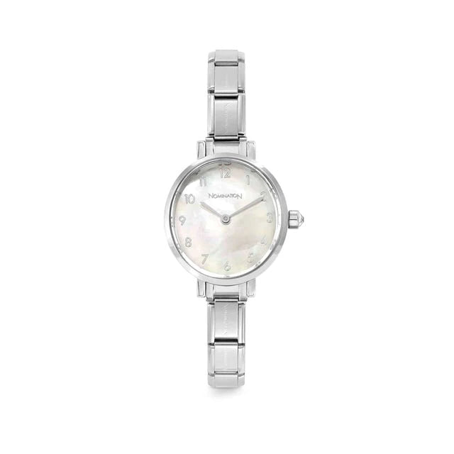 Stainless steel watch with Oval White Mother of Pearl dial and White Cubic Zirconia crown. Case size: 2.6 x 2.8 cm. Band width: 0.8 cm. Waterproof: 3 bars. You can personalise the watchband with original Composable Classic Links.