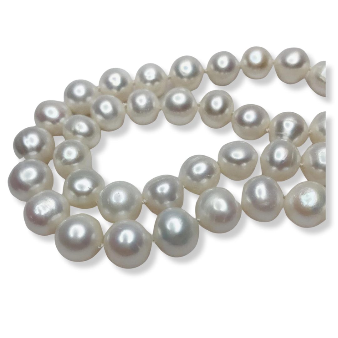 Elevate your jewellery collection with this refined pearl necklace, featuring lustrous white freshwater pearls strung to an elegant 50cm length. The piece is secured with a polished sterling silver ball clasp, combining timeless sophistication with reliable craftsmanship. Perfect for both everyday elegance and special occasions, this necklace offers versatile styling that complements any wardrobe. A classic investment piece that transcends trends.