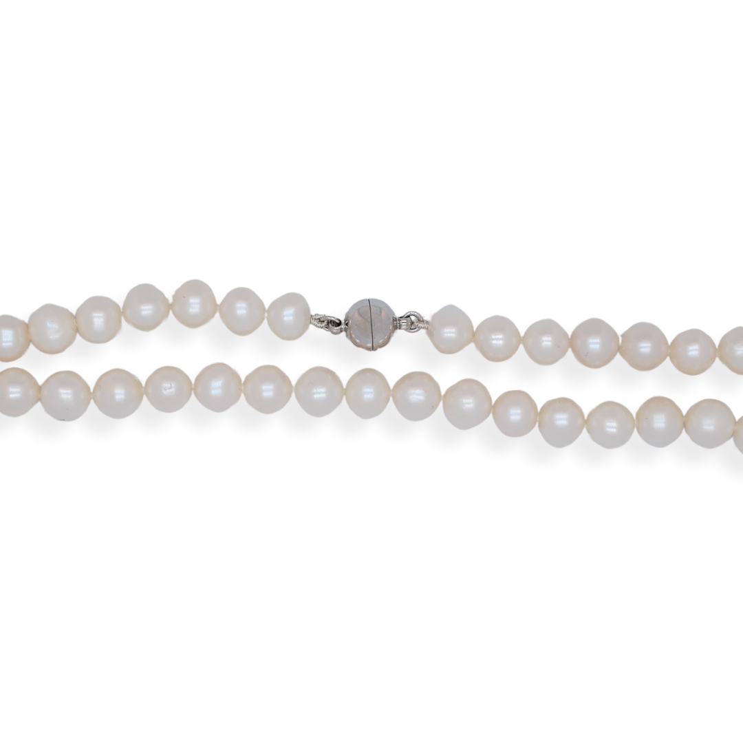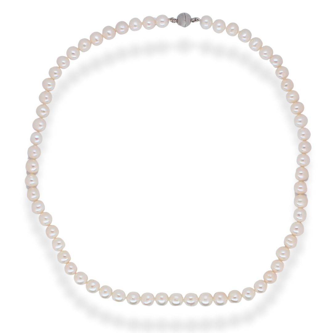 This elegant Pearl Necklace features exquisite White Fresh Water Pearls and a Sterling Silver Ball Clasp. Crafted with precision and expert design, this necklace radiates sophistication and timeless beauty. Perfect for any occasion, it is a must-have accessory for the modern woman. 47cm