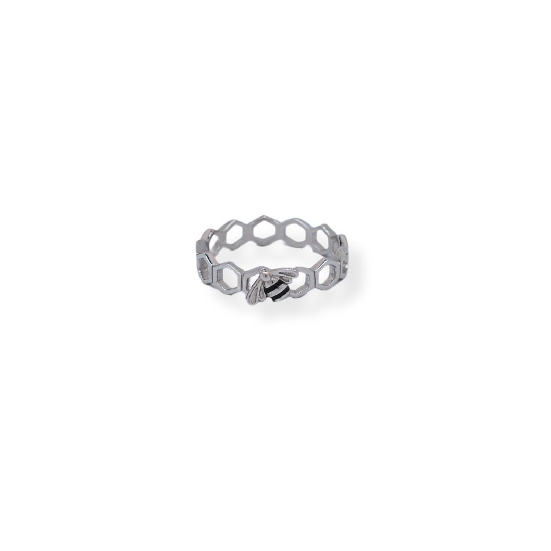 This Silver bee ring features a bee on the band which is designed to look like a bee hive. Made of high-quality silver, this ring is perfect for nature lovers and adds a touch of unique style to any outfit.