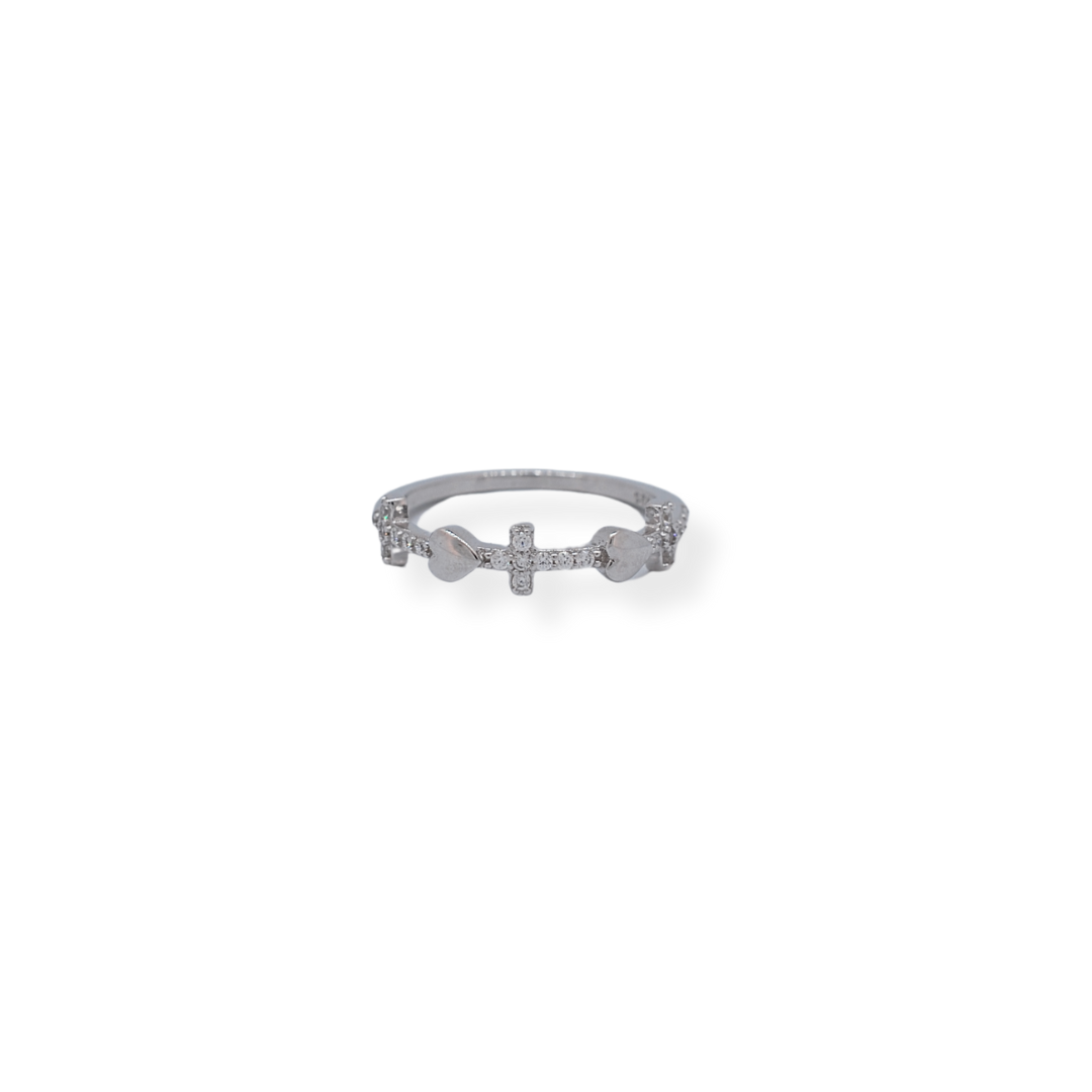 This silver cz band ring features a beautifully crafted cross design adorned with sparkling cubic zirconia stones. Made with high quality silver, this ring adds a touch of elegance and spirituality to any outfit.
