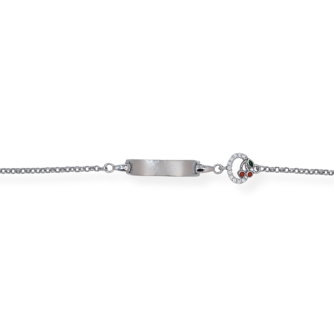 This silver cz ID bracelet is adorned with a beautiful cherry charm, adding a touch of elegance to your look. Made with high-quality silver and featuring sparkling cubic zirconia stones, this bracelet makes for a stylish and sophisticated accessory. 20cm