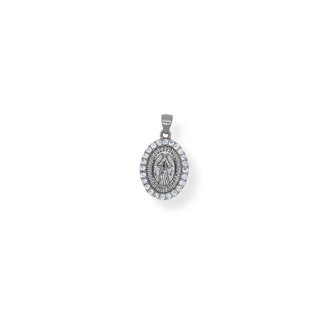 This elegant silver pendant features a stunning cz mother Mary design. Crafted with high-quality materials, this pendant adds a touch of sophistication to any outfit. The intricate details and sparkling center stone make it a must-have accessory for any jewelry collection. 17mm