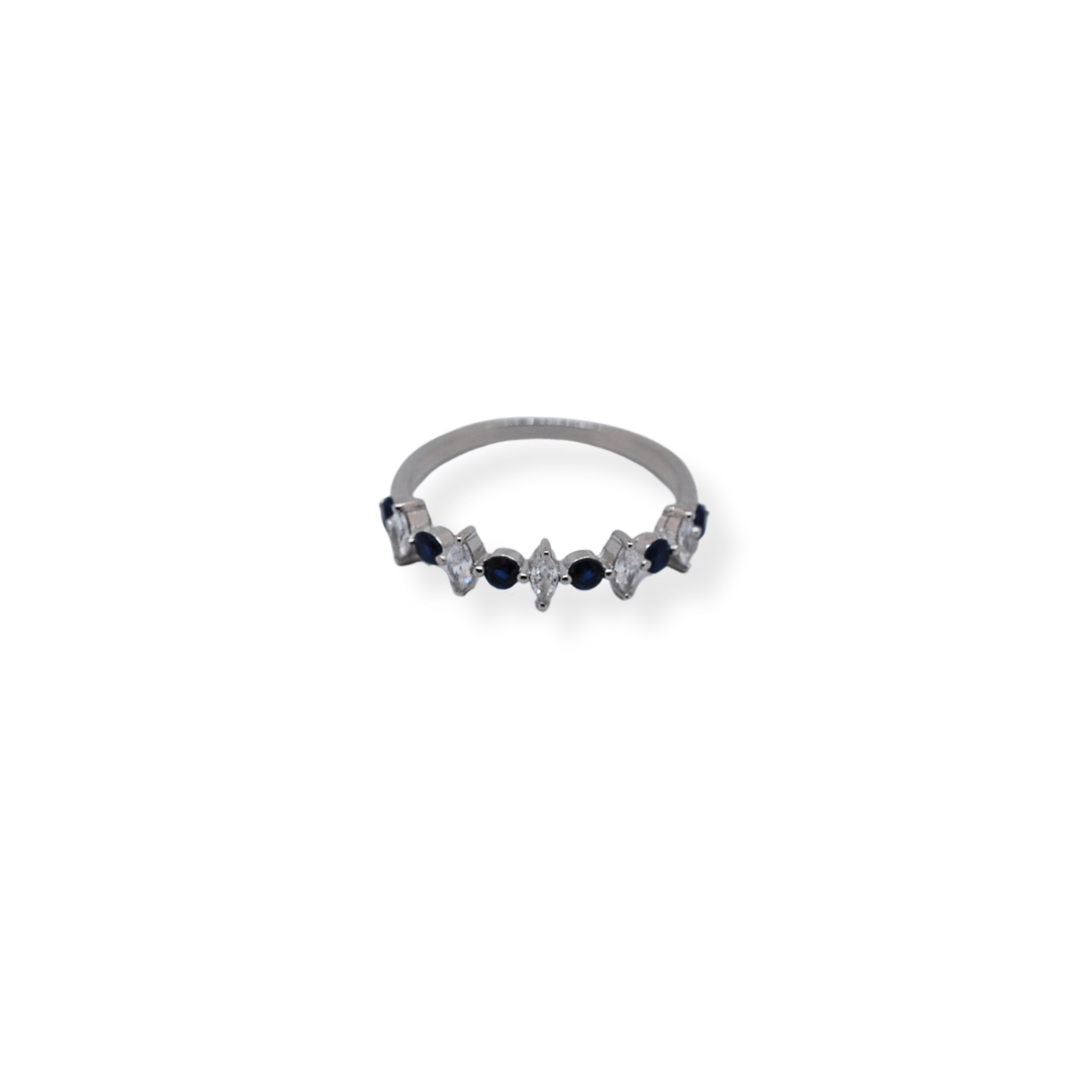 This elegant silver ring features a stunning combination of blue and white CZ stones. Crafted with high-quality materials, it adds a touch of sophistication to any outfit. Perfect for special occasions or everyday wear, this ring is a must-have for any jewelry collection.